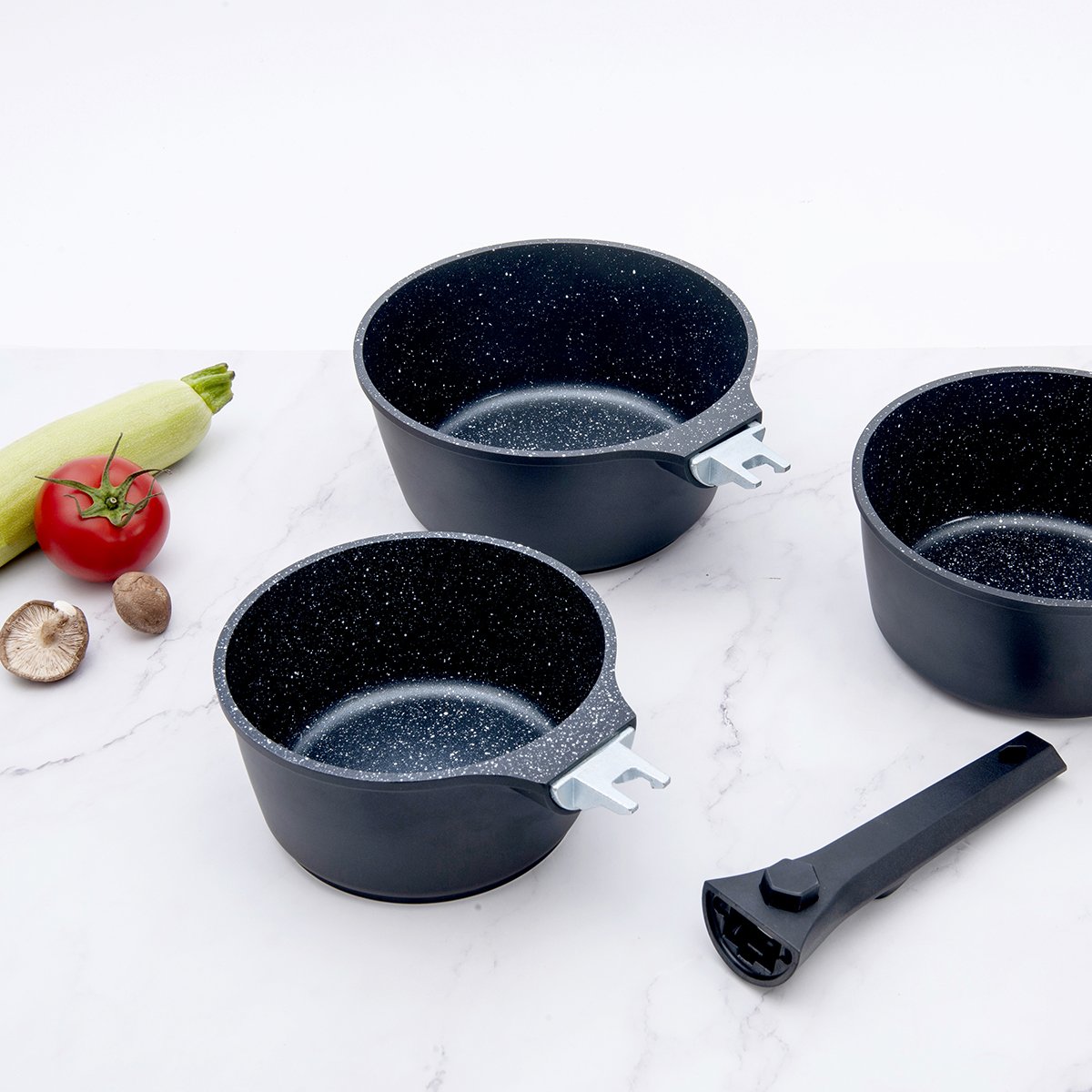 A key highlight of the Laguiole Alizée 3 Saucepan Set 16/18/20 cm Black Removable Handle is its innovative detachable handle system.
