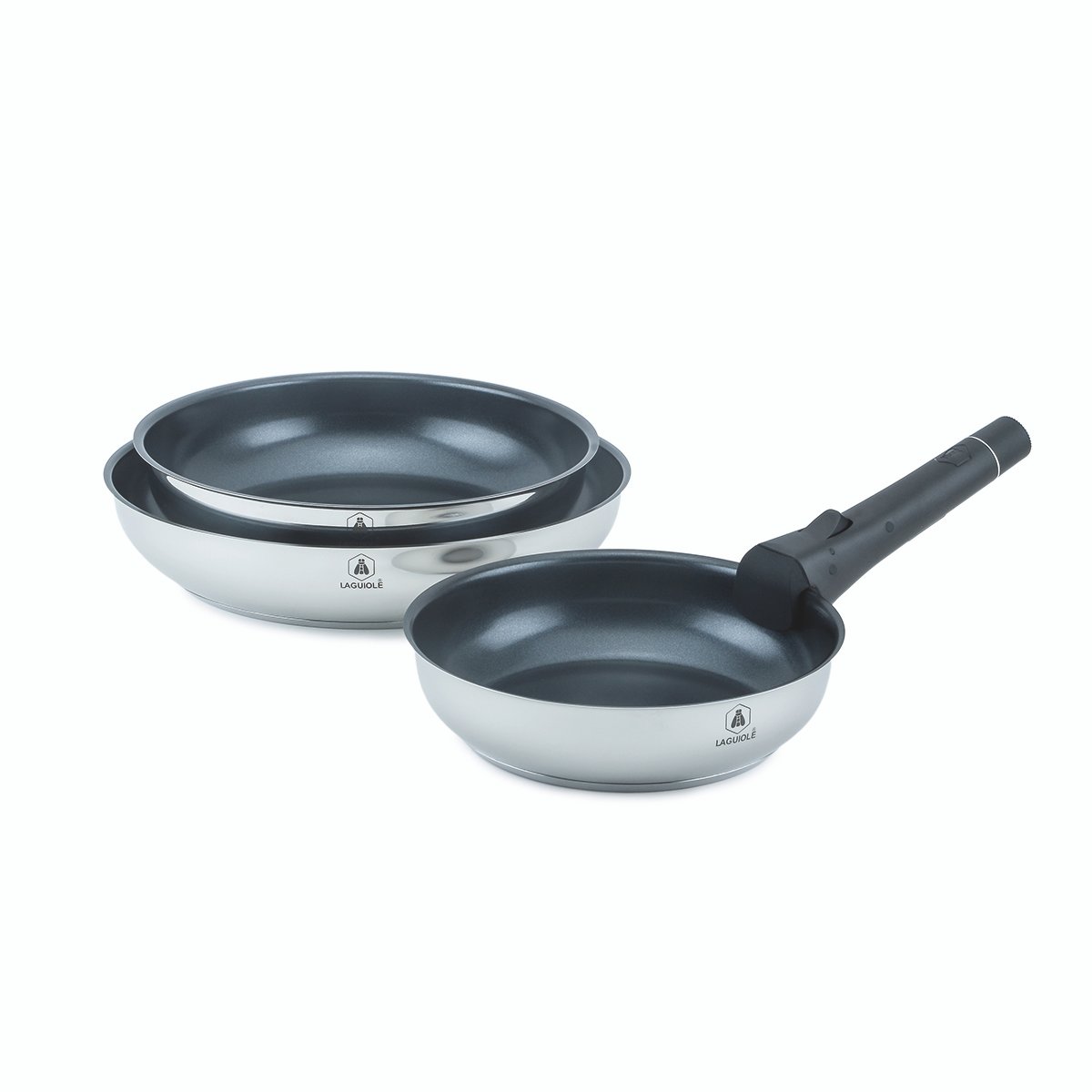 Laguiole – “Réactive” 3-frying pan set with removable handle (20/24/28 cm) Stainless steel, Greblon® CK2 ceramic non-stick coating, induction compatible