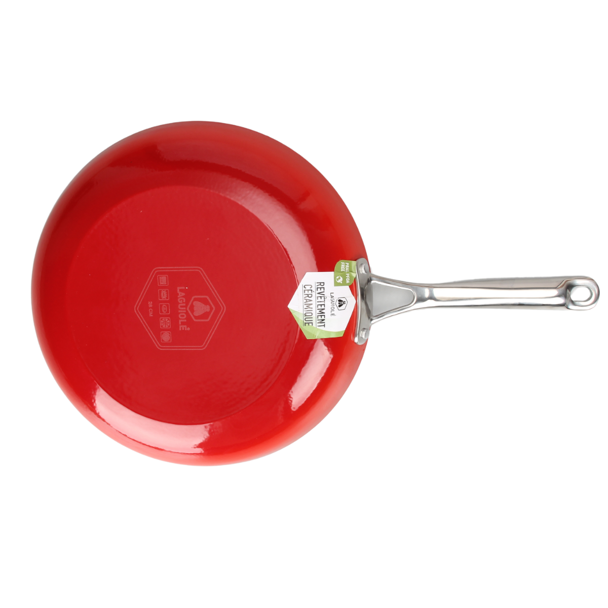 The cooking surface of the Laguiole Red AirIron Sauté Pan 28×5.5cm features a durable ceramic non-stick coating designed to make cooking easier and more efficient.