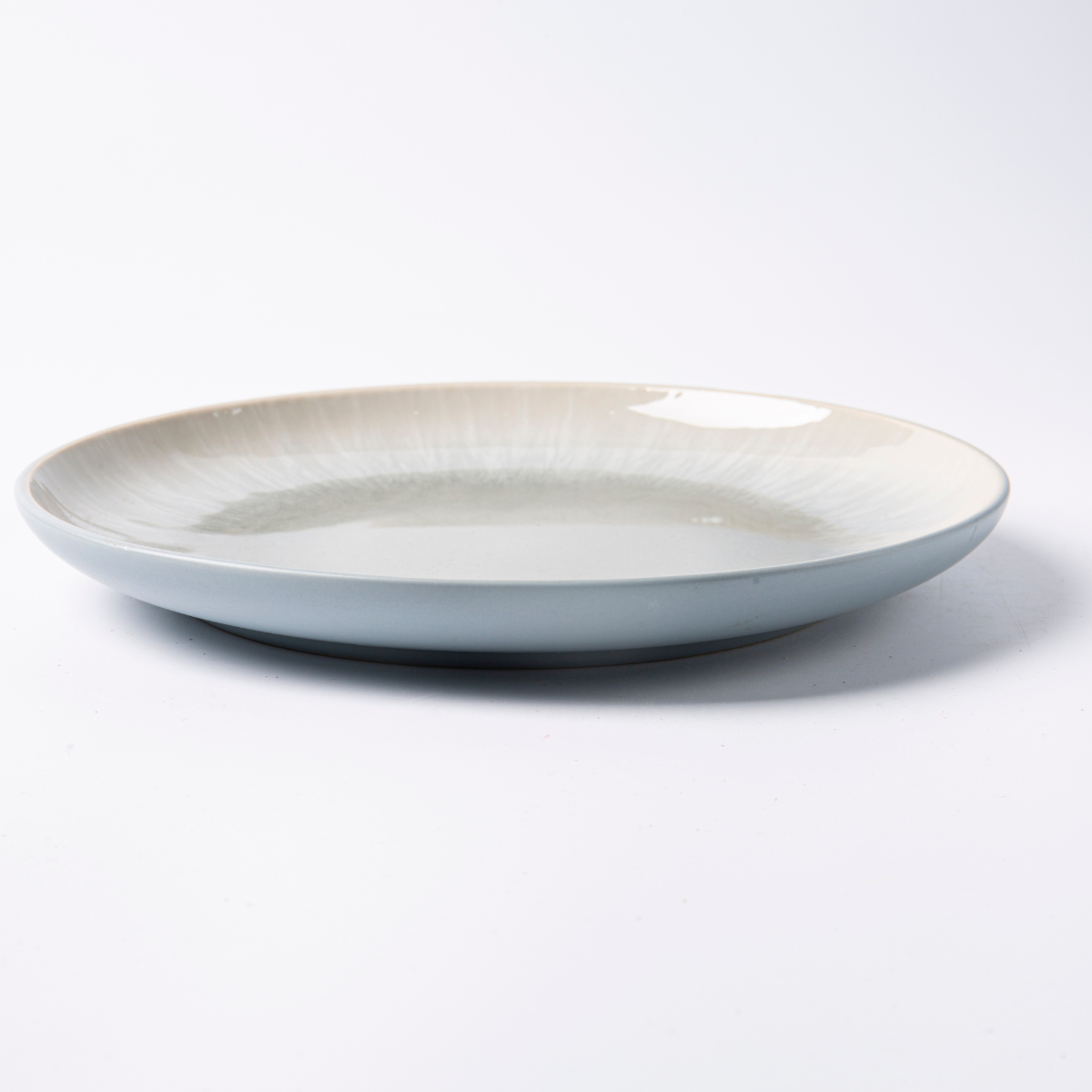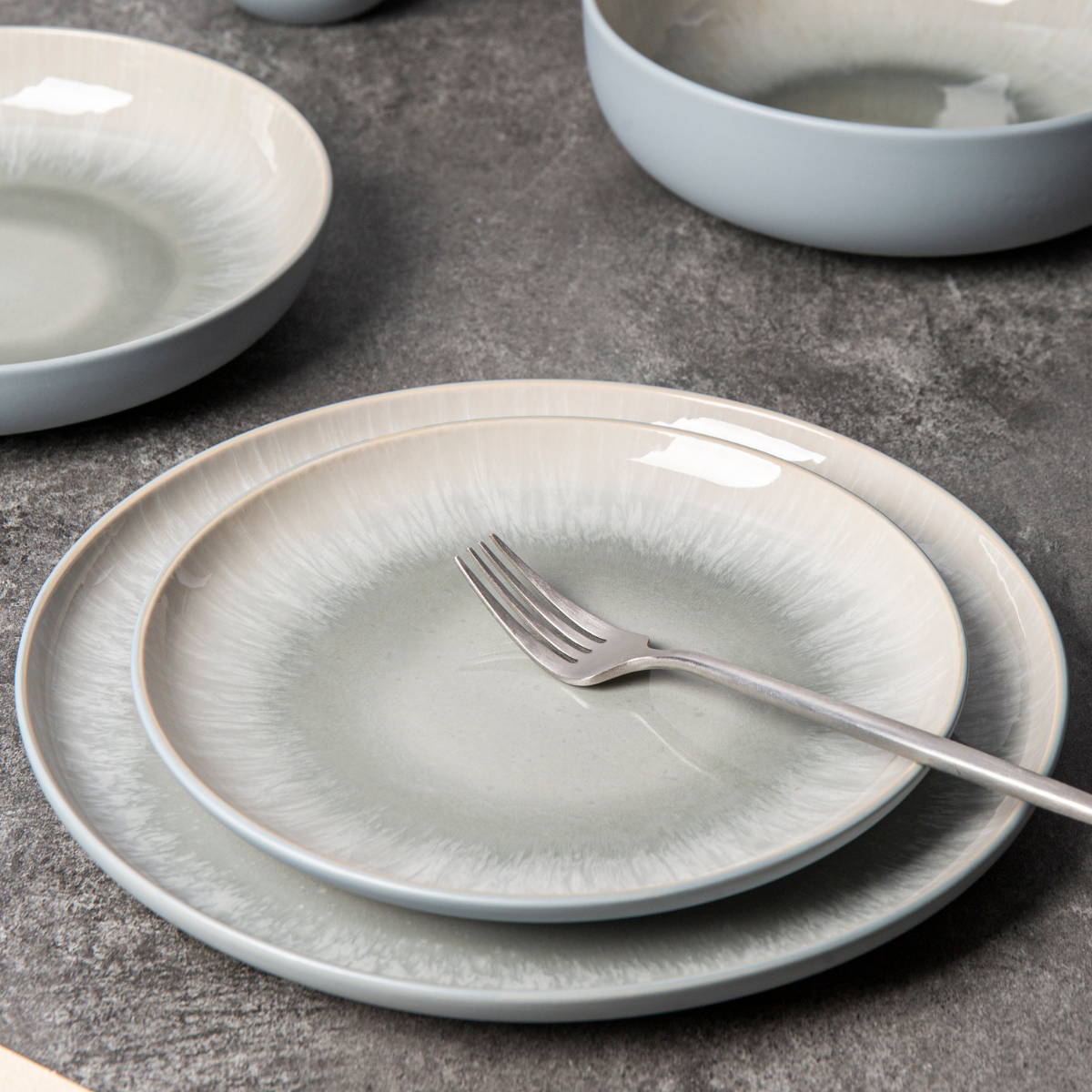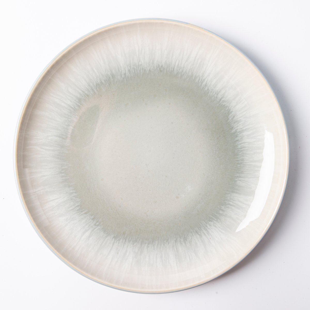 Reactive glazed stoneware tableware is made from fired clay, after which color pigments are applied piece by piece onto reactive glazes. It is then coated with a glaze to give it a smooth, durable finish. This technique creates a rustic, artisanal appearance, making each piece of tableware unique.
